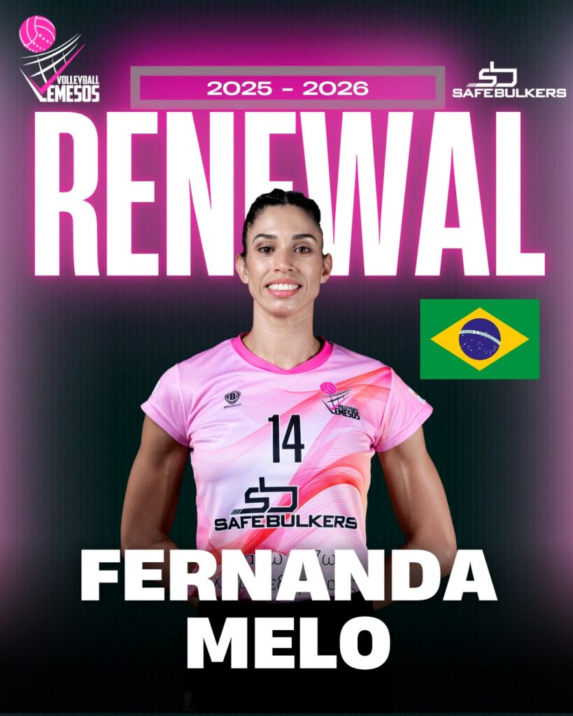 Τη Βραζιλιάνα Fernada Melo ανανέωσε και για τη φετινή σεζόν η LEMESOS VOLLEYBALL. Πρόκειται για πετοσφσιρίστρια που στο παρελθόν αγωνίστηκε στον ΠΑΦΙΑΚΟ. Η Melo είναι Βραζιλιάνα διαγώνιος με ύψος 1.82 και αγωνίστηκε σε αρκετές ομάδες στην καριέρα της. Η Βραζιλιάνα πετοσφαιρίστρια έπαιξε σε Βραζιλία, Αργεντινή, Περού, Αζερμπαιτζάν και στην Ελλάδα με τον Α.Ο. ΘΗΡΑΣ.
